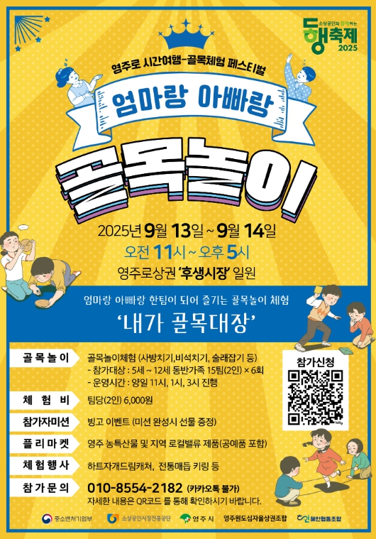 [파이낸셜경제=김지훈 기자] 영주시는 오는 9월 13일부터 14일까지 영주1동 후생시장 일원에서 ‘영주로 시간여행–엄마랑 아빠랑 골목놀이’ 체험 행사를 개최한다고 밝혔다.