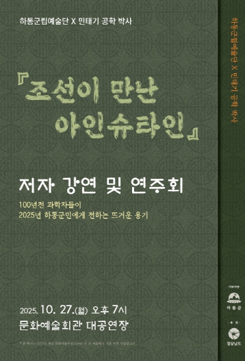 저자 민태기 박사는 근대화 시기 조선의 역사적 인물과 과학에 대한 이야기를 '조선이 만난 아인슈타인'강연을 통해 쉽게 풀어내며, 하동군립예술단의 연주가 이를 음악적으로 표현해 ‘과학과 역사가 음악으로 만나는 시간 여행’을 선사할 예정이다.