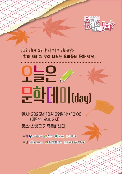 [파이낸셜경제=김예빈 기자] 산청군은 오는 29일 가족문화센터에서 ‘오늘은 문학데이(day)’를 운영한다고 24일 밝혔다.