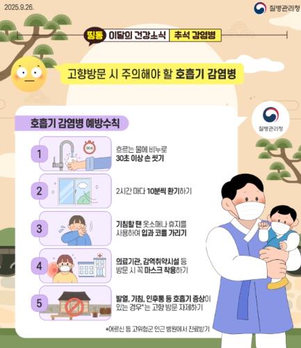 울주군보건소 관계자는 “소중한 가족을 만나기 전에 스스로 건강 상태를 점검하고 감염병 예방수칙을 실천하는 것이 무엇보다 중요하다”며 “어르신과 만성질환자를 위한 작은 배려가 큰 보호로 이어진다”고 말했다.