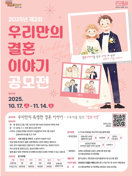 [파이낸셜경제=김예빈 기자] 김해시는 시민 참여와 공감을 기반으로 결혼의 긍정적 의미를 확산하고 가족의 가치를 널리 알리기 위해‘제2회 우리만의 결혼 이야기 공모전’을 개최한다고 21일 밝혔다.