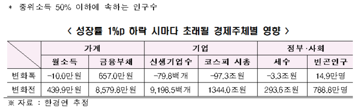 한경연 분석결과 성장률이 1%p 떨어질 경우 경제주체별로 미치는 영향은 ▲가계부문 금융부채는 657만원 늘어나고, 월소득이 10만원씩 감소하며, ▲기업 관련 지표는 신생기업 수가 7,980 개 사라지고, 코스피 시가총액이 97.3조원 증발하는 것으로 분석됐다. ▲정부·사회 부문에서는 국세수입이 3.3조원 감소하고, 상대적 빈곤인구수*는 14.9만명이 증가하는 것으로 나타났다.