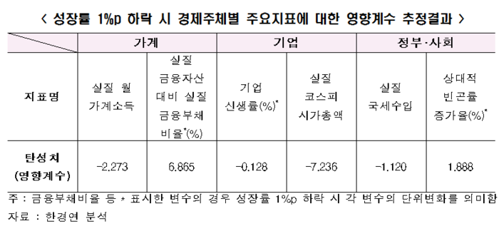 GDP에 대한 탄성치를 살펴보면, 성장률이 1%p 하락할 경우 ▲가계부문에서 실질 월가계소득이 2.3% 감소하고, 실질 금융부채비율이 6.9%p 높아졌으며 ▲기업부문에서는 활동기업 수 대비 신생기업 수 비율인 ‘기업 신생률’이 0.1%p 하락하고, 실질 코스피 시가총액이 7.2% 감소했다. ▲정부·사회부문을 보면 실질 국세수입이 1.1% 감소하며, 소득이 중위소득 50% 이하에 속하는 인구비율인 ‘상대적 빈곤률’ 증가율이 1.9%p 높아졌다.