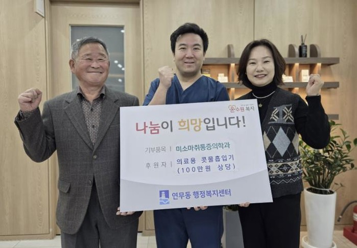 김승범 미소통증의학과 원장은 “연무동과의 협력을 통해 지역사회에 기여할 수 있어 뜻깊게 생각한다”며 “앞으로도 연무동과 함께하는 나눔 활동에 지속적으로 참여하겠다”고 전했다.