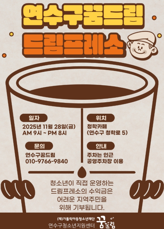 [파이낸셜경제=김기보 기자] 연수구학교밖청소년지원센터 ‘꿈드림’은 오는 28일 청학카페(청학로 5)에서 학교 밖 청소년이 직접 운영하는 일일 카페 ‘드림프레스’를 연다.