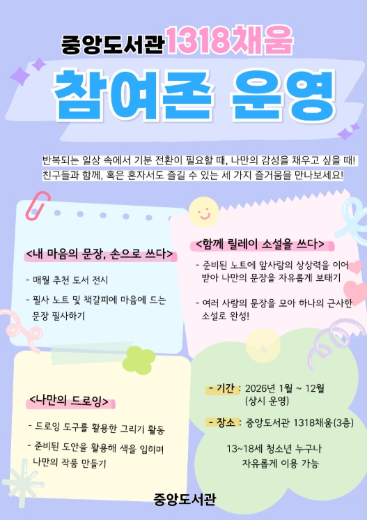 참여존에서는 ▲내 마음의 문장, 손으로 쓰다 ▲함께, 릴레이 소설을 쓰다 ▲나만의 드로잉 코너가 마련돼 청소년들의 자율적인 활동을 지원한다.