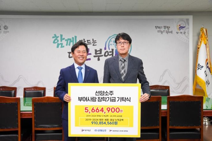 [파이낸셜경제=김영란 기자] ㈜선양소주는 지난 26일 부여군청을 방문하여 인재 육성을 위한 장학금 566여만 원을 (재)부여군굿뜨래장학회에 기탁했다.