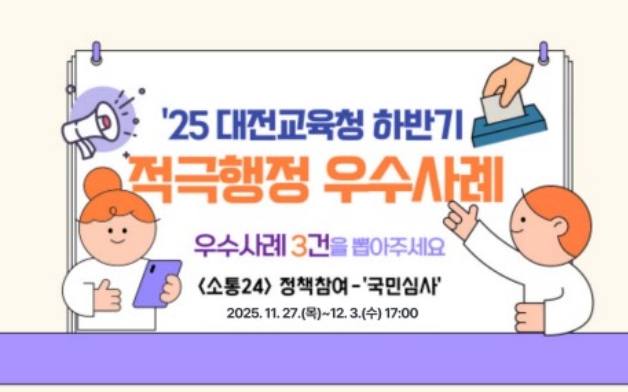 [파이낸셜경제=김영란 기자] 대전시교육청은 11월 27일부터 12월 3일까지 2025년 하반기 적극행정 우수사례를 선발하기 위한 온라인 국민심사를 실시한다고 밝혔다.