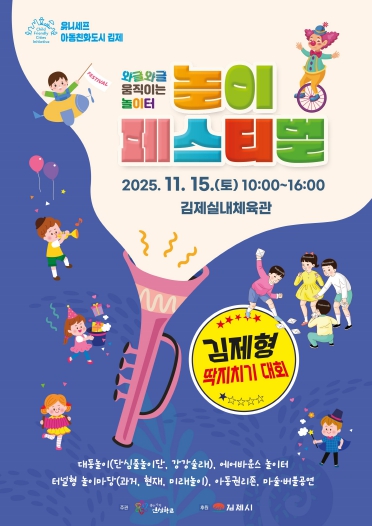 [파이낸셜경제=김예빈 기자] 김제시는 아이들이 자유롭게 놀며 성장하는 아동친화도시 실현을 위해 오는 15일, 김제실내체육관 및 주차장 일대에서 와글와글 움직이는 놀이터,‘제2회 놀이페스티벌’행사를 개최한다고 밝혔다.