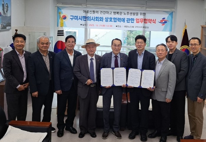 [파이낸셜경제=김지훈 기자] (사)대한노인회구미시지회(회장 이재호)와 구미시한의사회(회장 진용인)가 지난 21일 구미노인종합복지관 지회장실에서 어르신 건강증진 및 노인성 질환 예방을 위한 ‘행복경로당 주치의 사업’업무협약을 체결했다.