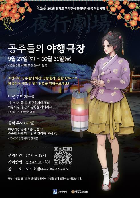 경기도와 경기관광공는 '2025 경기도 구석구석 관광테마골목’지원사업에 선정된 수원 화성 행리단길에서 특별 야간 관광 프로그램 ‘공주들의 야행극장’을 오는 9월 27일부터 10월 31일까지 운영한다고 17일 밝혔다.