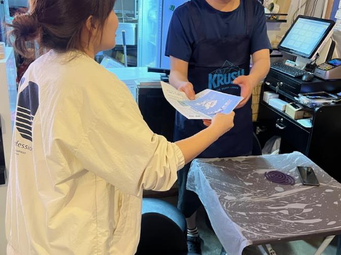 | ▲ 구 직원이 영업자 준수사항 홍보물을 배부하고 있다. |