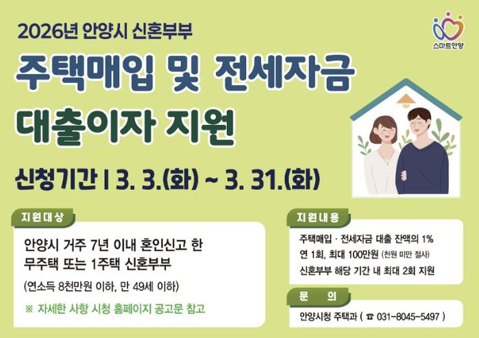 [파이낸셜경제=김기보 기자] 안양시가 ‘2026년 신혼부부 주택매입 및 전세자금 대출이자 지원사업’을 시행한다고 4일 밝혔다.