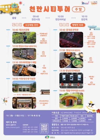 이계자 관광과장은 “천안 시티투어는 천안을 하나의 이야기로 경험하는 관광 콘텐츠”라며 “유연한 코스 운영을 통해 다시 찾고 싶은 관광도시 천안을 조성하겠다”라고 밝혔다.
