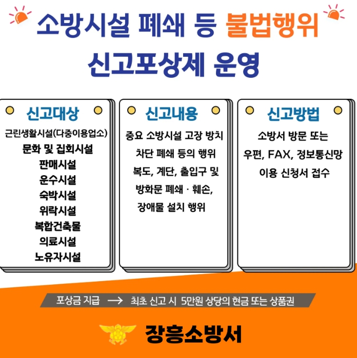 이 제도는 다중이용시설과 공동주택 등에서 발생하는 비상구 폐쇄, 소방시설 차단 등 불법행위를 주민이 발견해 알릴 수 있도록 한 제도로, 불법행위가 확인되면 소정의 포상금이 지급될 수 있다.