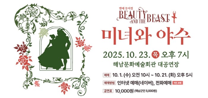 [파이낸셜경제=김예빈 기자] 해남군은 오는 10월 23일 오후 7시 해남문화예술회관 대공연장에서 발레뮤지컬 ‘미녀와 야수’공연을 선보인다.