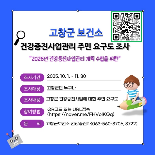 [파이낸셜경제=김예빈 기자] 고창군보건소가 통합건강증진사업 주민요구도 조사를 11월30일까지 실시하고 있다.