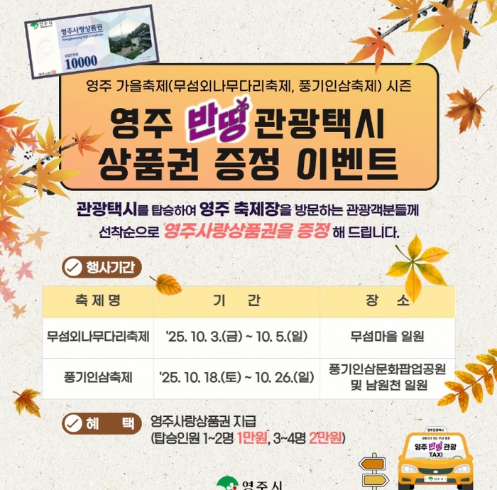 [파이낸셜경제=김지훈 기자] 가을 빛으로 물드는 10월, 영주시는 여름 축제에 이어 가을 축제 시즌에도 ‘영주 반띵관광택시’를 이용해 축제장을 찾는 관광객에게 최대 2만 원 상당의 영주사랑상품권을 증정하는 이벤트를 진행한다고 23일 밝혔다.