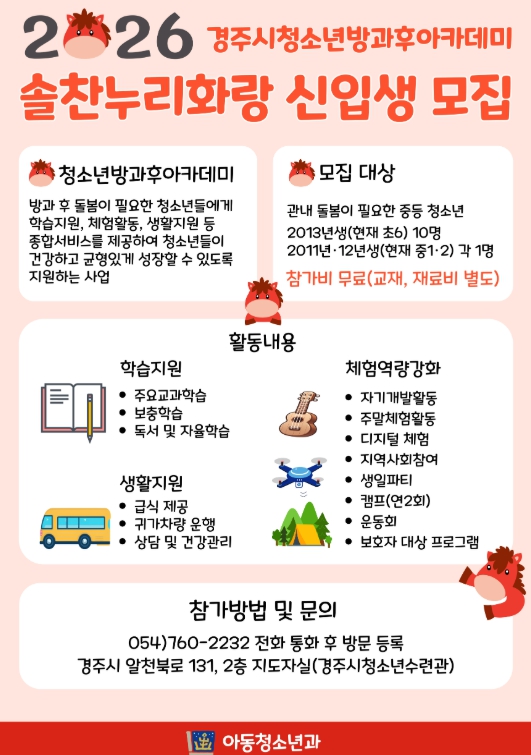 [파이낸셜경제=김지훈 기자] 경주시청소년방과후아카데미 ‘솔찬누리화랑’은 오는 20일부터 2026년도 참가자 12명을 모집한다.
