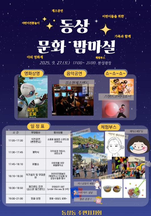 동상동 주민자치회 김기성 회장은 “이번 동상 문화 밤마실 행사는 2025년도 주민자치사업으로 기획하고 함께 참여하는 축제로, 누구나 자유롭게 참여할 수 있으며, 다양한 프로그램과 체험을 준비하여 일상 속 문화 향유의 기회를 제공하고 많은 분들이 함께 즐기면서 주민들의 화합을 다지는 특별한 밤이 될 것”이라며 “많은 주민 여러분들의 관심과 참여를 부탁드린다”고 전했다.