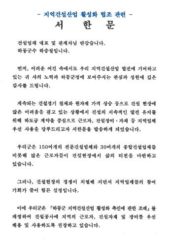 하승철 하동군수는 서한문을 통해 “지역 건설의 지속적인 발전 유지를 위해 하도급 계약을 중심으로 근로자, 건설장비·자재 등 지역업체를 우선 사용해 달라”고 요청했다.
