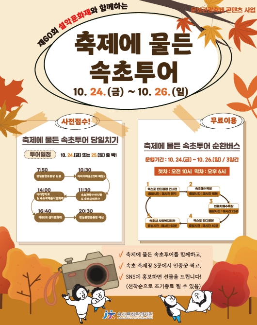 [파이낸셜경제=조성환 기자] (재)속초문화관광재단은 제60회 설악문화제를 맞아 수도권 시민들이 가을 정취 가득한 속초의 대표 축제들을 한 자리에서 체험할 수 있도록 특별 기획된 문화관광 콘텐츠 ‘축제에 물든 속초투어’를 운영한다.