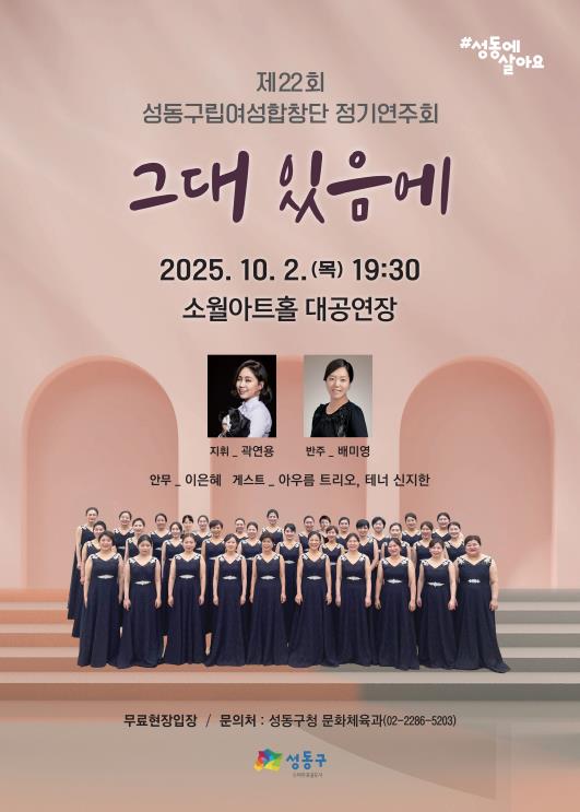 [파이낸셜경제=김예빈 기자] 서울 성동구는 오는 10월 2일 저녁 7시 30분 소월아트홀에서 성동구립 여성합창단 '제22회 정기 공연'을 개최한다고 밝혔다. 공연 부제는 '그대 있음에'로 가을밤, 구민들에게 사랑과 위로의 하모니를 선사할 예정이다.