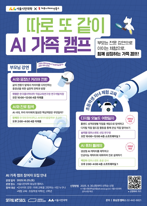 이번 캠프는 서울시민대학 동남권 캠퍼스(서울 강동구 고덕로 399)에서 운영되며, 참가비는 무료다. 가족 단위 신청뿐만 아니라 AI에 관심 있는 시민이라면 누구나 단독으로 신청할 수 있다. 참가를 원하는 시민은 9월 30일부터 서울시평생학습포털을 통해 신청하면 된다.