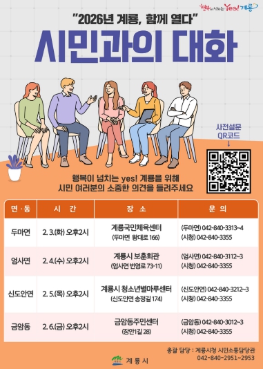 시 관계자는 “시민과의 대화는 시정의 출발점이자 가장 중요한 소통 창구”라며 “시민 한 분 한 분의 소중한 의견이 계룡의 미래를 여는 밑거름이 될 수 있도록 열린 자세로 경청하고 시정에 충실히 반영하겠다.”고 말했다.