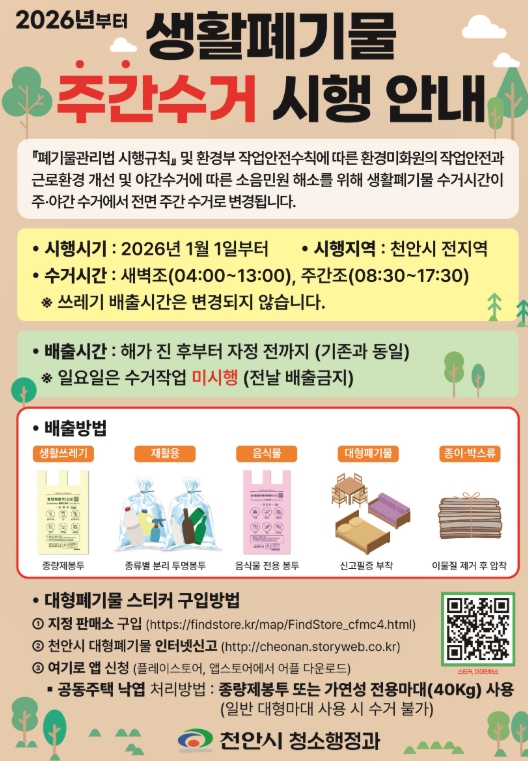 [파이낸셜경제=김영란 기자] 천안시는 근로자의 안전 확보와 안정적인 수거체계 확립을 위해 내년부터 생활폐기물 야간 수거를 폐지하고 주간에만 수거한다고 5일 밝혔다.