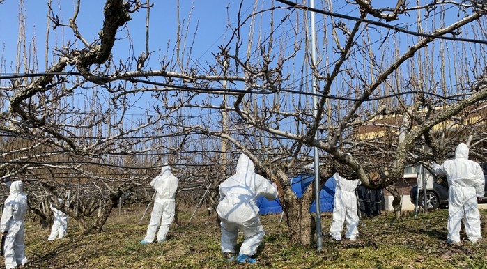 과수화상병은 세균에 의해 발생하는 병으로, 사과와 배 등 식물의 잎과 꽃, 가지, 줄기, 과실까지 감염돼 마치 불에 그을린 듯 검게 말라 죽는 증상을 보이며, 법정 전염병으로 의무방제를 실시해야 한다. 효과적인 예방을 위해서는 정해진 시기에 맞춘 단계별 방제가 중요하다.
