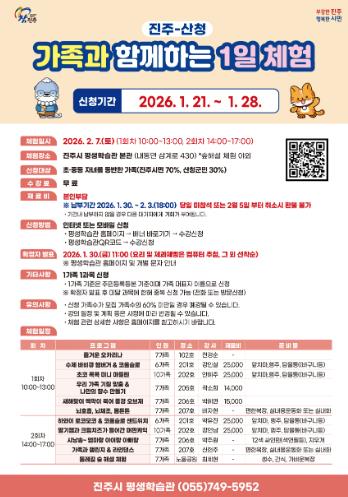 이번 체험 행사는 2월 7일 진주시 평생학습관 본관 등에서 개최되며, 초·중등 자녀를 동반한 진주시민과 산청군민 가족을 대상으로 한다.