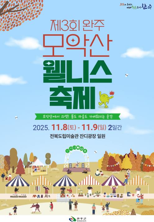 [파이낸셜경제=김영란 기자] 완주군은 오는 11월 8일부터 9일까지 전북도립미술관 야외광장 일원에서 웰빙, 건강, 행복을 주제로 ‘제3회 완주 모악산 웰니스 축제’를 개최한다.