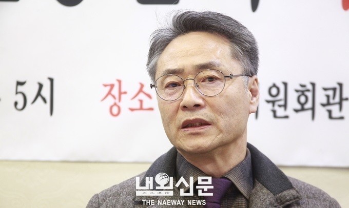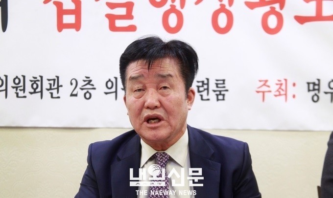 ▲ 안산역사(驛舍) 기부채납자인 명우건설(주) 김철중 회장이 13일 오후 국회에서 긴급 기자회견을 갖고 있다.