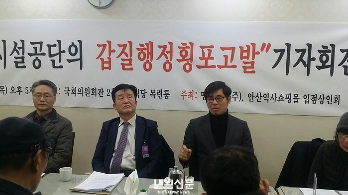 [파이낸셜경제]김윤정 기자= 한국철도시설공단과 안산역사(驛舍) 기부채납자 간에 무상사용 기간을 놓고 마찰이 일고 있는 가운데, 안산역사 기부채납자인 명우건설(주)와 임차인들은 13일 오후 서울 여의도 국회의원회관 목련룸에서 긴급 기자회견을 갖고 "한국철도시설공단의 갑질행정을 고발한다"고 밝혔다.