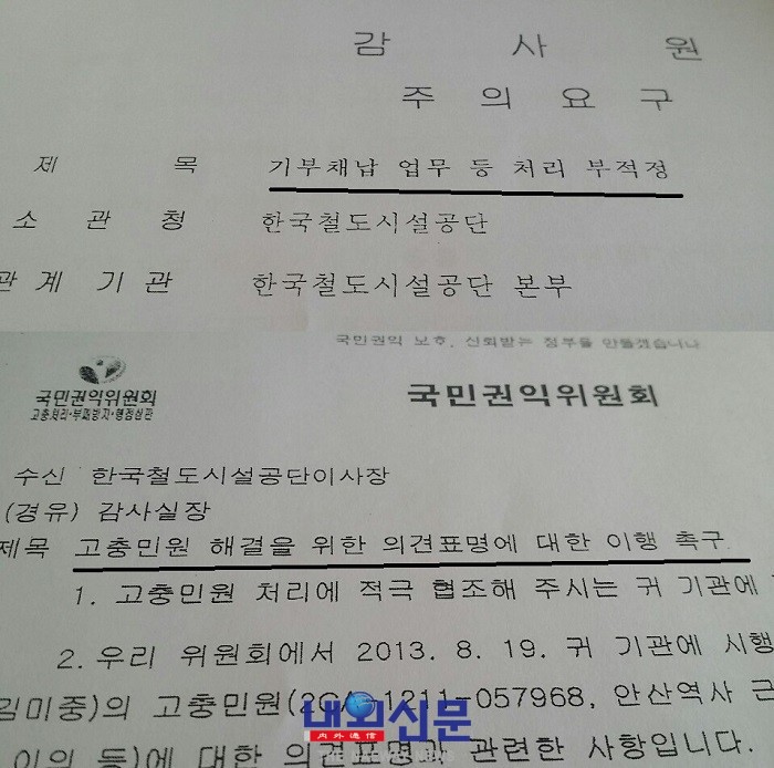| ▲ 감사원의 "기부체납 업무 등 처리 부적정 문제 제기" 공문과 국민권익위원회가 공단앞으로 보낸 "이행촉구" 공문, |