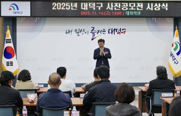 | ▲ 최충규 대덕구청장이 14일 구청 대회의실에서 열린 ‘2025년 대덕구 사진 공모전’ 시상식에 참석해 수상자들에게 인사말을 전하고 있다. |