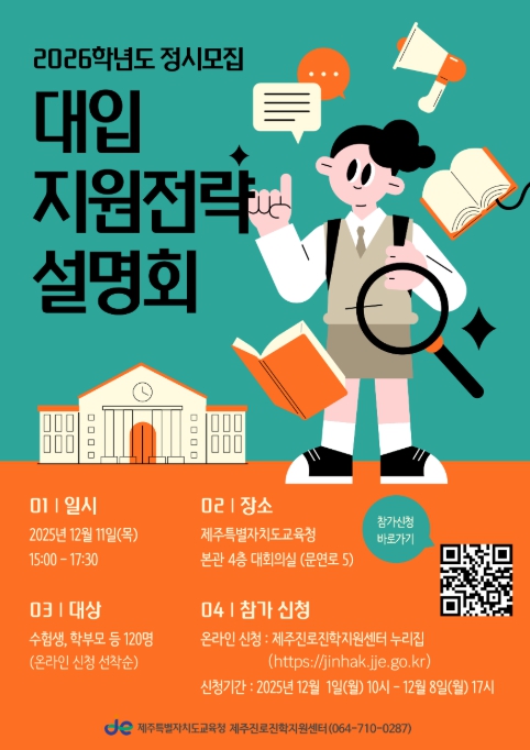 [파이낸셜경제=김영란 기자] 제주특별자치도교육청은 12월 11일 오후 3시부터 본관 4층 대회의실에서 ‘2026학년도 대입 정시모집 지원전략 설명회’를 개최한다.