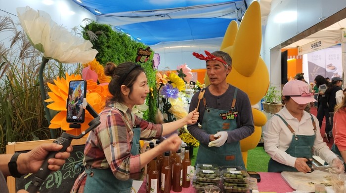 | ▲ 제농업박람회 함평홍보관 부스에서 해름 스토어 운영하는 모습과 라이브커머스 방송장면 |