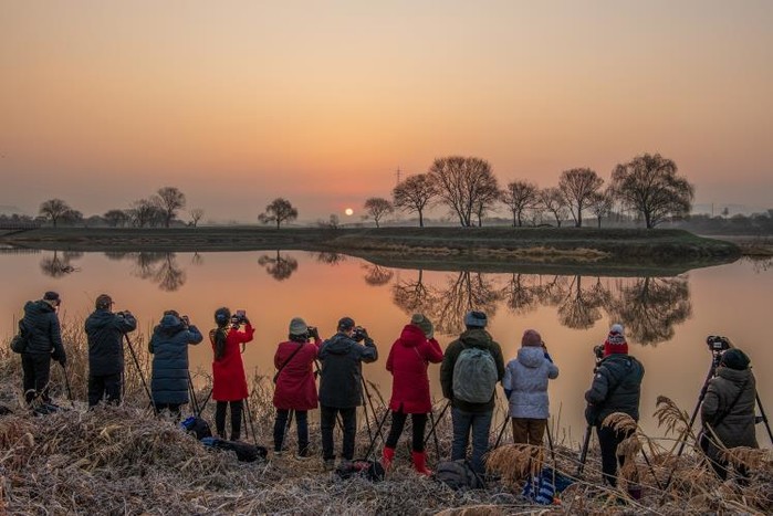 | ▲ 남도풍경연구소 소속 사진작가들이 동섬에서 떠오르는 해를 촬영하고 있는 모습.(사진 제공-나주시) |