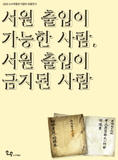 [파이낸셜경제=김지훈 기자] 영주시 소수박물관은 12월 1일부터 2026년 2월 22일까지 이달의 유물전시 ‘서원 출입이 가능한 사람, 서원 출입이 금지된 사람’을 개최한다.