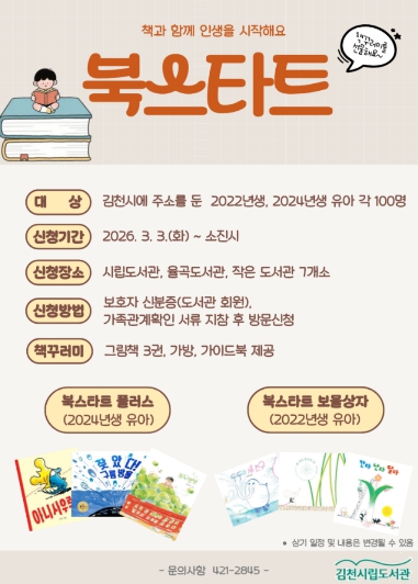 올해 북스타트 신청대상은 김천시에 주소를 둔 2022년생 유아 100명, 2024년생 유아 100명이며 보호자 신분증과 가족관계 확인서류(주민등록등본, 건강보험증 등)를 지참해 시립도서관, 율곡도서관, 작은도서관에 방문하여 신청하면 책꾸러미가 지급된다. 해당 가정은 연령별로 선정된 그림책 3권, 가이드북이 담긴 가방을 받을 수 있다.