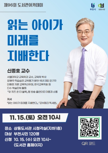 이번 도서관 아카데미는 10월 15일 오전 10시부터 부천시립도서관 홈페이지에서 선착순으로 신청할 수 있다. 모집 인원은 부천시민 120명이며, 기타 문의는 상동도서관 독서진흥팀으로 하면 된다.