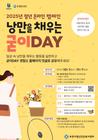 캠페인 참여 방법은 부천시정신건강복지센터 홈페이지 ‘참여마당-이벤트’ 게시판에서 ‘굳이DAY’ 실천 소감을 댓글로 작성하면 된다. 참여 대상은 관내 19세부터 39세까지의 청년이며, 캠페인은 11월 7일까지 진행된다. 참여자 중 150명을 추첨해 소정의 상품을 제공하며, 당첨자는 부천시정신건강복지센터 홈페이지에서 확인할 수 있다.