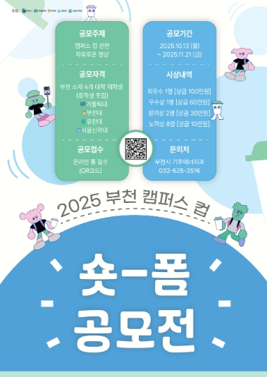 공모 대상은 ‘캠퍼스 컵’ 사업이 진행 중인 가톨릭대, 부천대, 유한대, 서울신학대 등 부천 소재 4개 대학 재학생과 휴학생이다. 참가자는 ‘캠퍼스 컵’을 주제로 1분 30초 이내의 숏폼 영상을 자유롭게 제작해 제출하면 된다.