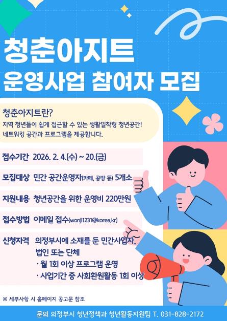 [파이낸셜경제=김기보 기자] 의정부시는 청년들이 일상 속에서 자유롭게 모이고 활동할 수 있도록 생활밀착형 청년공간 ‘청춘아지트’ 사업에 참여할 민간사업자를 모집한다.