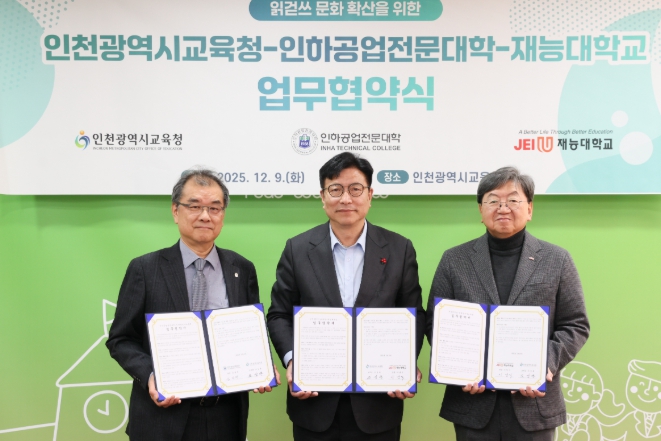 [파이낸셜경제=김기보 기자] 인천광역시교육청은 9일 인하공업전문대학, 재능대학교와 읽걷쓰 문화 확산을 위한 업무 협약을 체결했다.