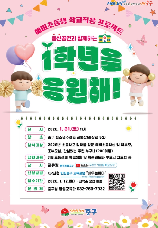 [파이낸셜경제=김기보 기자] 인천시 중구는 새 학기를 앞두고 오는 31일 오전 11시 영종국제도시 소재 중구청소년수련관 공연장에서 ‘예비 초등생 학교적응 프로젝트 - 1학년을 응원해!’를 개최한다고 밝혔다.
