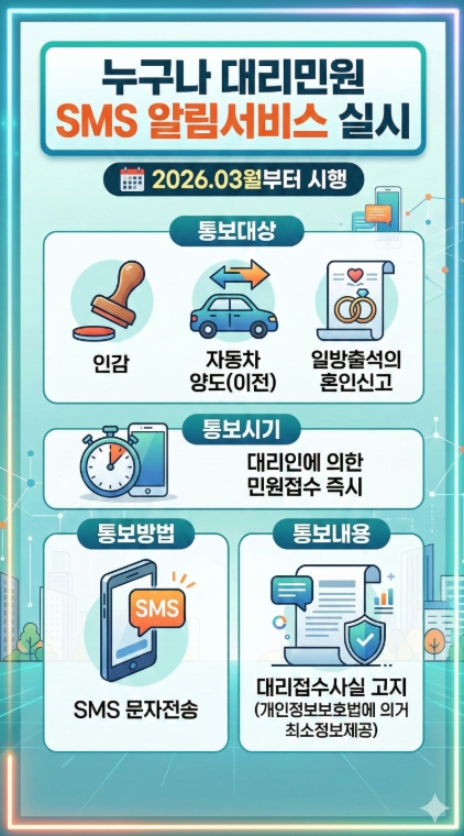 시 관계자는 “누구나 대리민원 SMS 안내서비스는 문제가 발생한 뒤 대응하는 방식이 아니라 사전에 예방하는 행정”이라며, “앞으로도 시민의 권익을 보호하고 신뢰받는 민원 행정을 구현하기 위한 적극 행정 서비스를 지속적으로 발굴해 나가겠다”고 말했다.