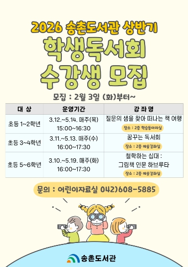 [파이낸셜경제=김영란 기자] 대전 대덕구 송촌도서관은 어린이들의 올바른 독서 습관 형성과 창의적 사고력 증진을 위해 ‘2026년 상반기 학생독서회’ 수강생을 모집한다.